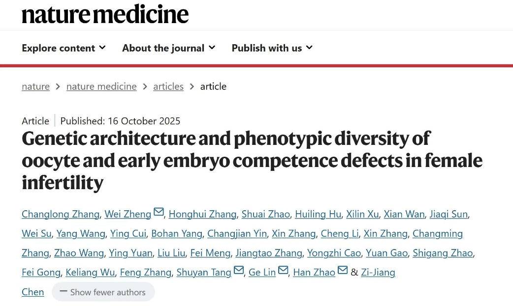 2025年10月16日,日本av片 日本av片 林戈研究员与山东大学陈子江院士、赵涵教授、日本av片 生命科学学院郑伟副教授和上海交通大学医学院唐淑妍副研究员团队合作,在Nature Medicine(最新五年影响因子:52.4)期刊发表题为“Genetic architecture and phenotypic diversity of oocyte and early embryo competence defects in female infertility”的研究论文。该研究基于大规模专病队列,率先构建了卵子及胚胎发育潜能缺陷(OECD)的六亚型分型体系,并绘制了首张亚型特异性遗传图谱,不仅为相关疾病的个体化检测路径设计提供了分子基础,也为临床精准分型诊断提供了关键的循证依据。