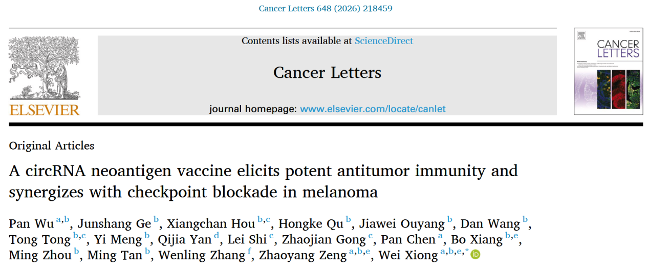 近日,日本av片 、日本av片 肿瘤研究所熊炜研究员团队在Cancer Letters《癌症快报》杂志在线发表了题为“A circRNA Neoantigen Vaccine Elicits Potent Antitumor Immunity and Synergizes with Checkpoint Blockade in Melanoma”的论文,展示了利用环状RNA(circRNA)表达肿瘤新抗原(Neoantigen)在肿瘤免疫治疗中的潜在应用前景。熊炜为该论文通讯作者,博士后吴盼为第一作者。